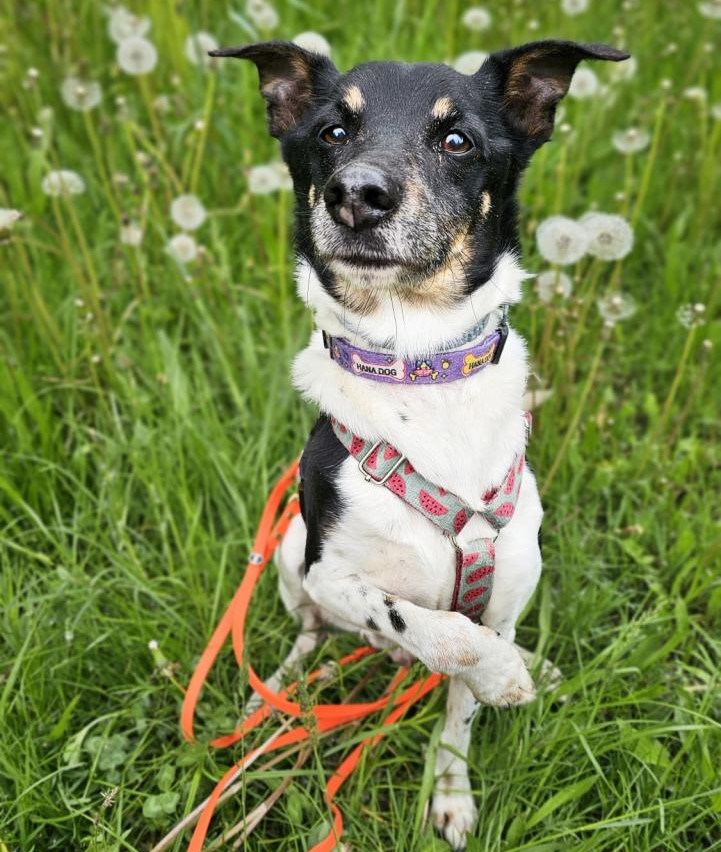 Poznaj Łatka – starszego dżentelmena z sercem szczeniaka i miną, jakby właśnie planował skok na kanapę. Ma około 12 lat, jest szczupłym raczej średniej wielkości pieskiem.