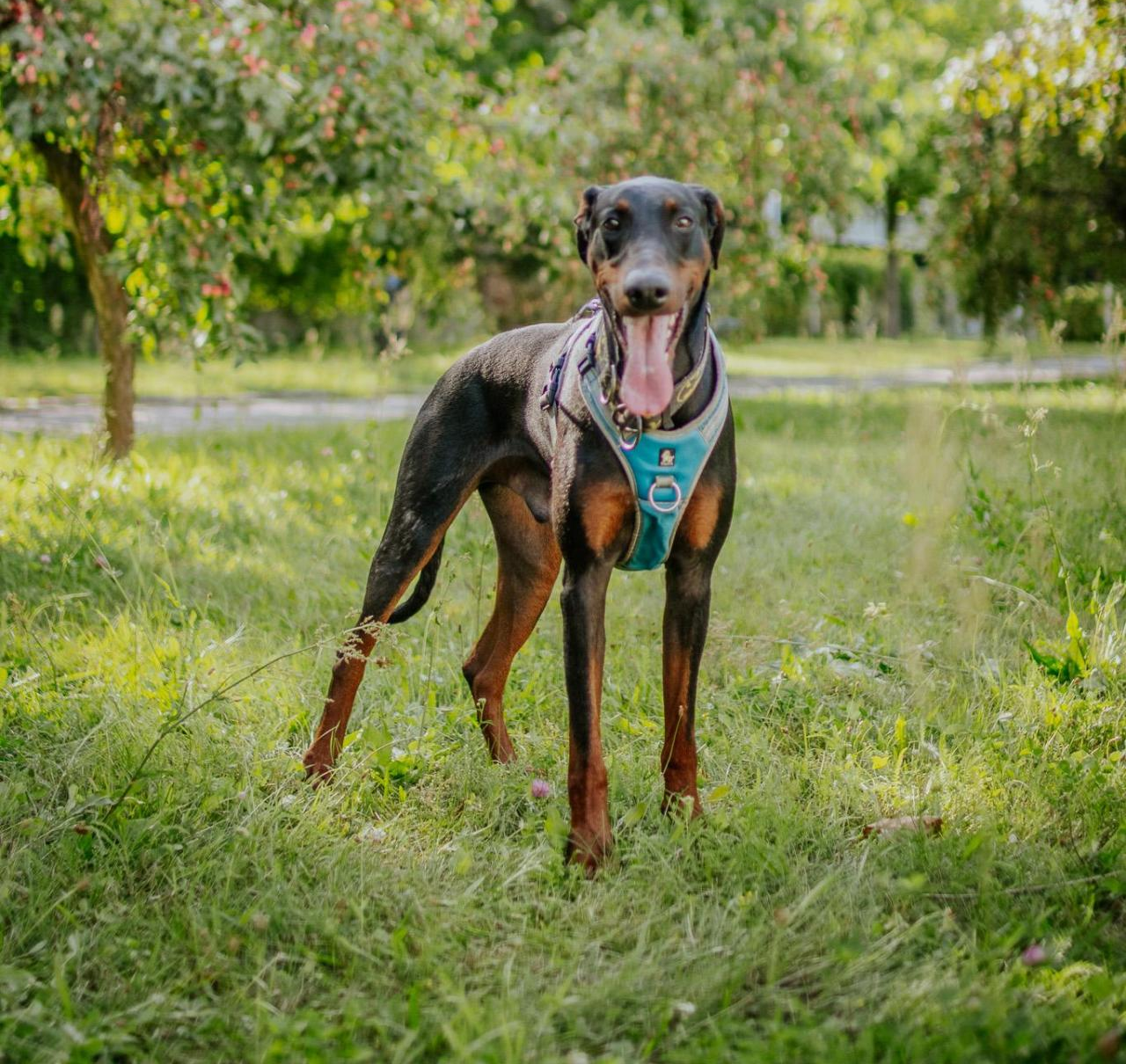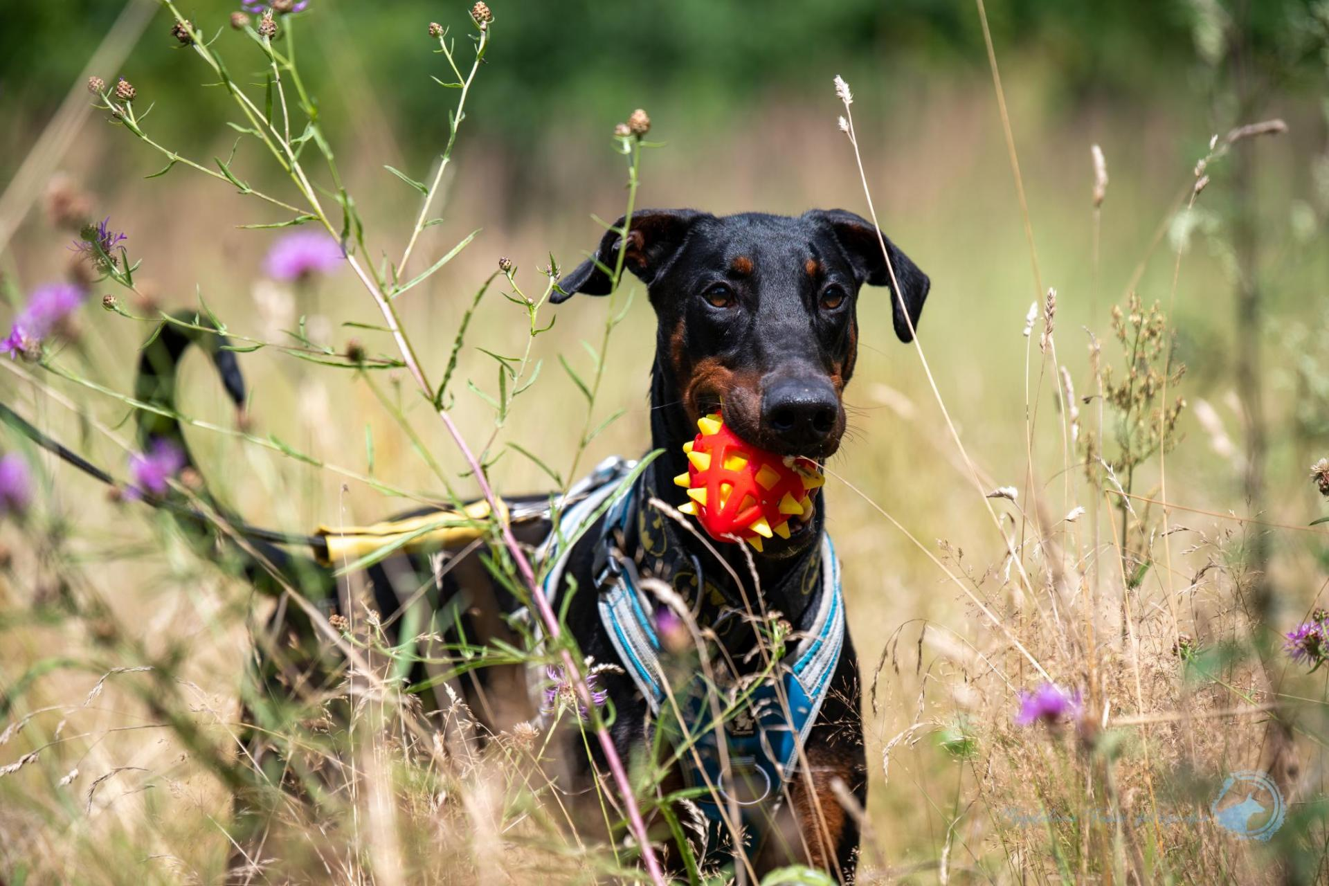 Ten przystojniak to doberman w wersji „naładowany jak espresso”. Radość życia? 11/10. Zabawa? Jego sens istnienia 🤪 Komendy? Zna! I co najlepsze – uwielbia się uczyć 💪 Ale uwaga: ma silne zdanie na temat trzymania smyczy. Uważa, że to jego obowiązek prowadzić człowieka, a nie odwrotnie 🙈